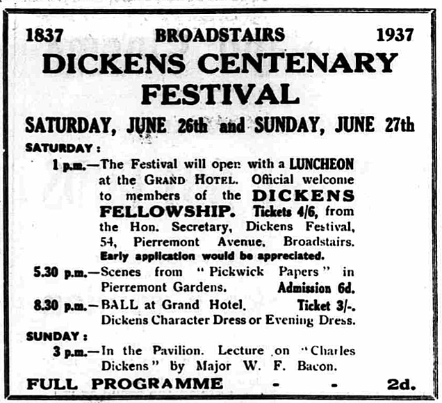 | Advert for the 1937 Dickens Festival - Thanet Advertiser - Tuesday 15 June 1937. British Newspaper Archives |